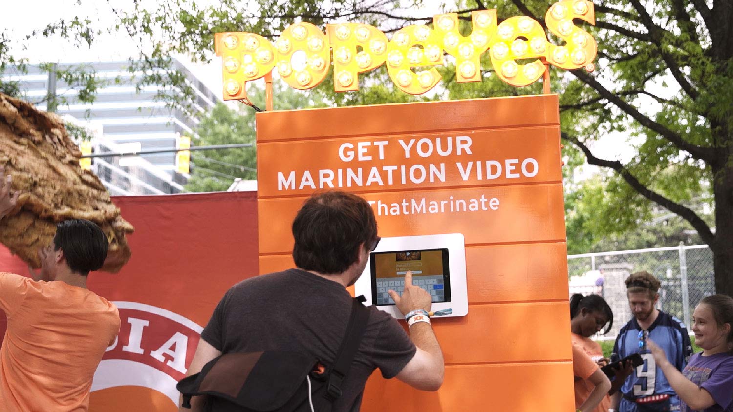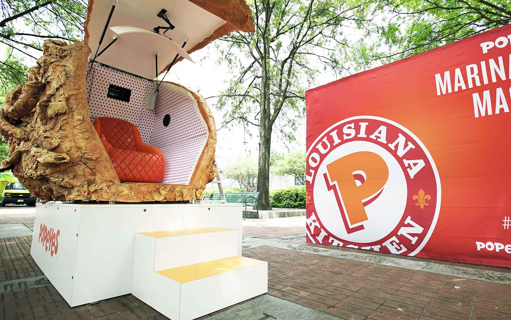In partnership with GSD&M Agency, Incite designed a social activation to highlight Popeyes Chicken’s 12-hour marination process in just 1.2 minutes. Activated at the Shaky Knees Festival in Atlanta, this giant piece of fried chicken called "The Marinating Machine” took visitors on a psychedelic video journey through worlds of chicken and spice while seated in a vibrating chair. Before entering, each participant posed for a photo that later appeared in the animated video, surprising viewers with a unique experience.